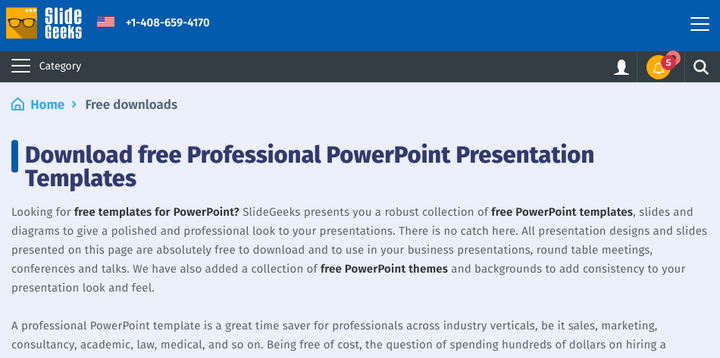 Mi experiencia con SlideGeeks ha sido bastante positiva. Se trata de una página web dedicada a proporcionar plantillas de PowerPoint de alta calidad, con una amplia gama que se adapta a distintas necesidades y gustos. El diseño del sitio es intuitivo y fácil de navegar, lo que facilita el proceso de búsqueda de los usuarios. Lo más destacado es que ofrece una variedad de recursos gratuitos, incluyendo plantillas, gráficos y diagramas, que son de gran ayuda para mejorar las presentaciones. Además, la descarga de estos recursos es simple y rápida, lo que optimiza el tiempo de los usuarios.